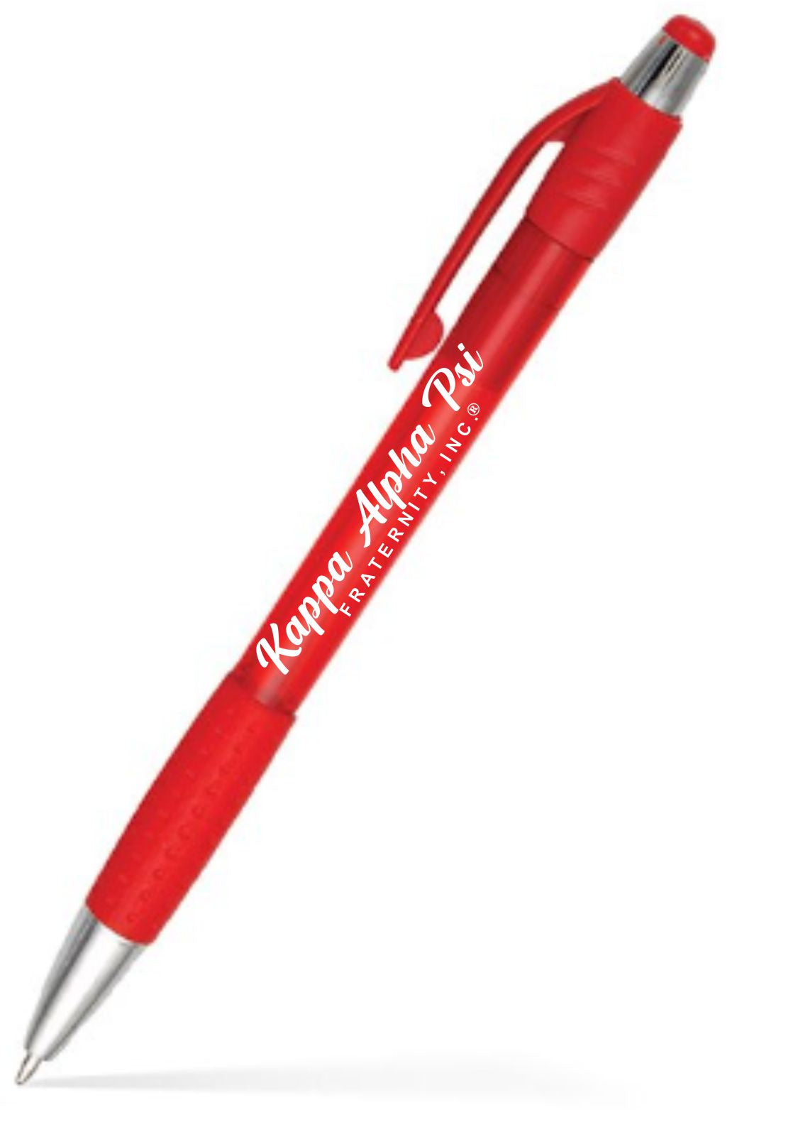 With its colored accent at the top, this retractable pen is offered in a vibrant translucent color with golf ball polka dotted rubber grip for added comfort.