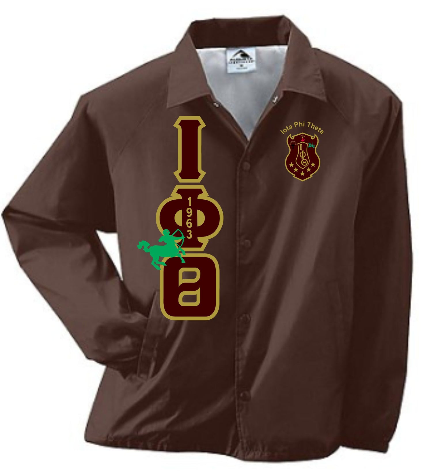 These traditional crossing line jackets are a must have for the new initiate. As with all of our crossing line jackets, the letters are sewn on applique and the organizational emblem is fully embroidered into the garment. This garment is sized for adults (men) and is constructed of 100% nylon taffeta and lined with 100% polyester brushed tricot. It features a snap front, raglan sleeves, byron collar, elastic cuffs, open bottom with NO drawcord and reinforced slash front pockets.