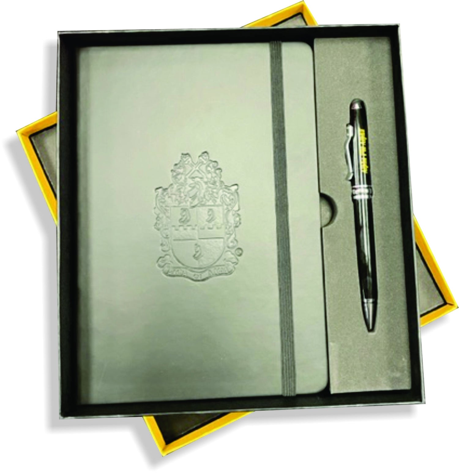 Our exclusive Alpha Executive Gift Set includes a soft faux leather journal elegantly debossed with the organizational crest. The journal has 80 ruled pages, elastic loop closure and bookmark with document pocket on inside back cover.