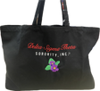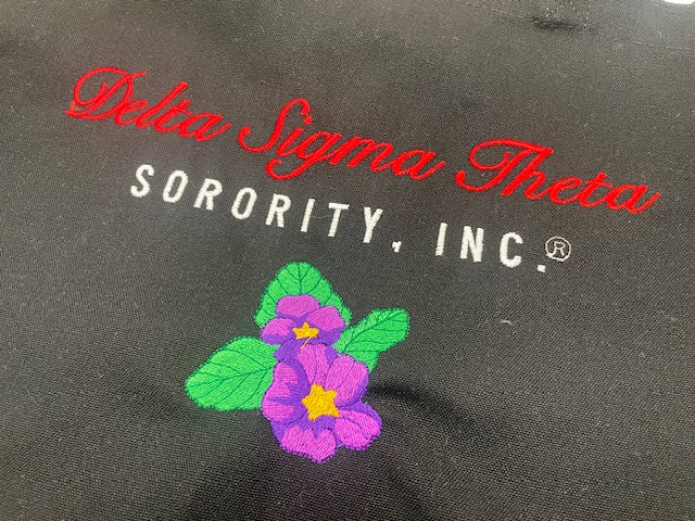 This tote is embroidered with your Sorority in an elegant script font and an added symbol below for added appeal and pop!