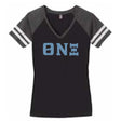 Distressed printed stripes on the sleeves give this tee a retro, sporty look. This is a ladies fit t-shirt.