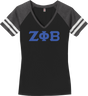 Distressed printed stripes on the sleeves give this tee a retro, sporty look. The 3 Greek letters make it your own. This is a ladies fit t-shirt, so its flirty, fashionable and fun to wear!