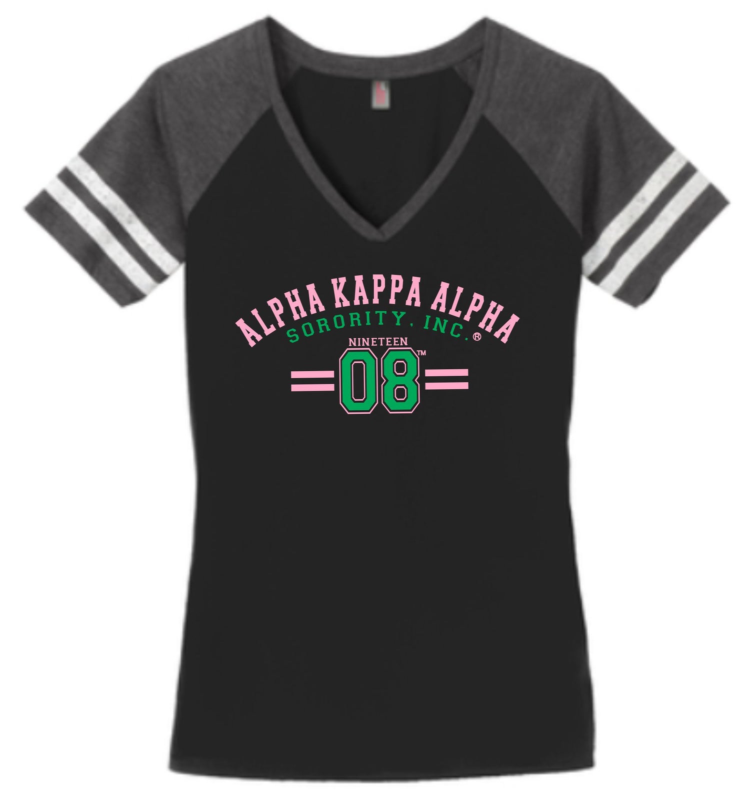 Hmm, wondering what to wear to those tailgates this fall??ÃÂ We have you covered, fit right in with this sporty new look! Distressed printed stripes on the sleeves give this tee a retro sporty look. It has a printed front design.ÃÂ 4.5 oz 60/40 ring spun combed cotton/poly Crossover V-Neck.