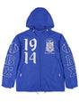 Fend off that winter weather in this windbreaker. This 100% polyester jacket is fully decorated using the colors and symbols of your favorite organization. Knit cuffs keep your arms protected. You'll be ready for that sudden storm with the concealable hood. Side zippered pockets help safeguard your items. This one is a keeper!
