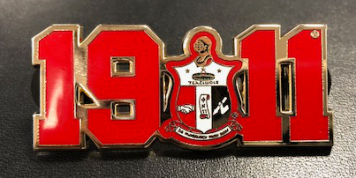 This lapel pin is perfect for any occasion. It has your year and crest in the middle and a gold tone finish with your organizational colors shining boldy throug. It is a two prong lapel pin that has a rubber backing. and measures 2" W x .72" H.