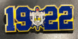 This lapel pin is perfect for any occasion. It has your year and crest in the middle and a gold tone finish with your organizational colors shining boldy throug. It is a two prong lapel pin that has a rubber backing. and measures 2" W x .72" H.