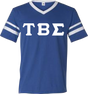 The 3 Greek letters take center stage in this classic style. The 3 stripes on the sleeves add interest and contrast to the flattering v neck style. The applique letters are sewn into, not pressed onto, our high quality adult (mens) jersey. It will be an everyday favorite!