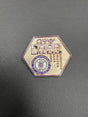 This new pin features the organizational crest, pictures of the founders, and the letters. It fastens with a safety style pin is on the back. It measures about 1.5" tall and about 2" wide.